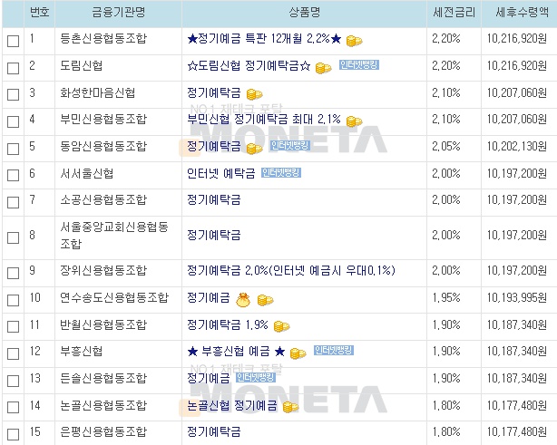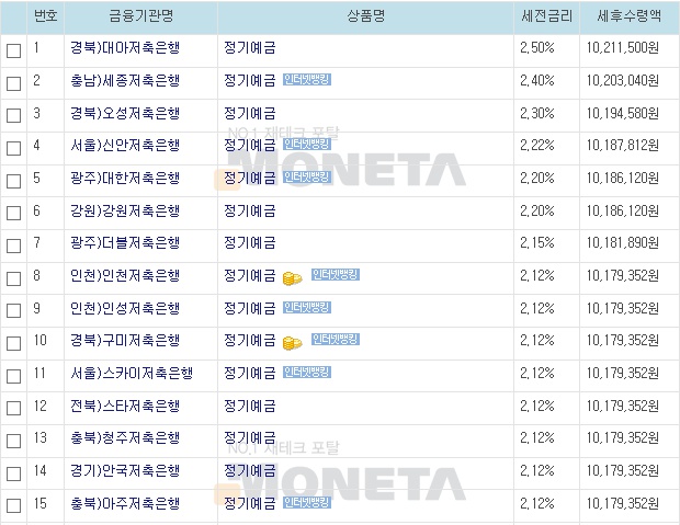 예금 상품은 각 금융기관별 고시금리 기준이며